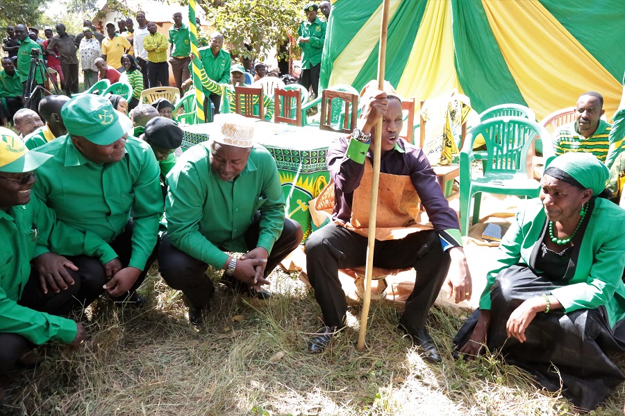 Mkuu wa Wilaya ya Buhigwe mkoani Kigoma, Kanali Marco Gaguti akizungumza huku ameketi kwenye kigoda. Katika tukio hilo Mjumbe wa Kamati Kuu ya CCM, Mwenyekiti wa Jumuia ya Wazazi Tanzania Alhaj Abdallah Bulembo na viongozi wengine walilazimika kichuchumaa kwa kuwa ni sharti kuwa kila mtu awe amekaa au amechuchumaa wakati kiongozi wa kabila la Waha mwenye kuheshimika anapokuwa anazungumza akiwa amekaa kwenye kigoda.